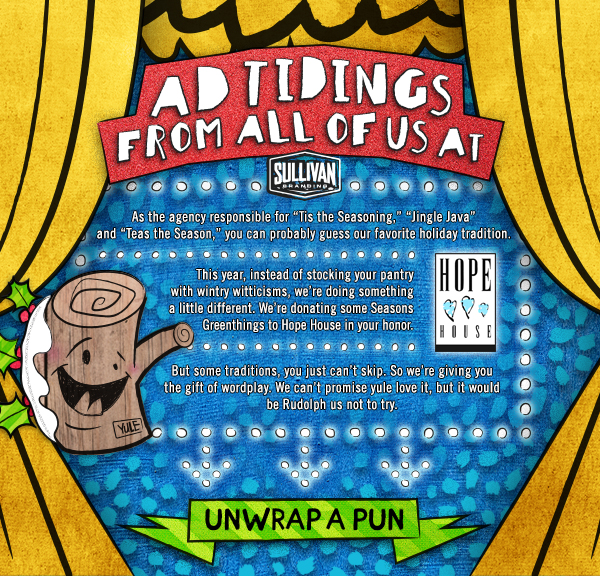 Though the fruit baskets and cookie samplers that appear in offices during the holidays are appreciated, they’re rarely memorable. In 2016, the agency opted to make donations to a local charity in clients’ names. We added an element of whimsy by creating a pun generator. I developed the concept and wrote copy for the website and email, as well as a couple dozen holiday puns. (Yes, the domain name – Winter Punderland – was my idea, too.)